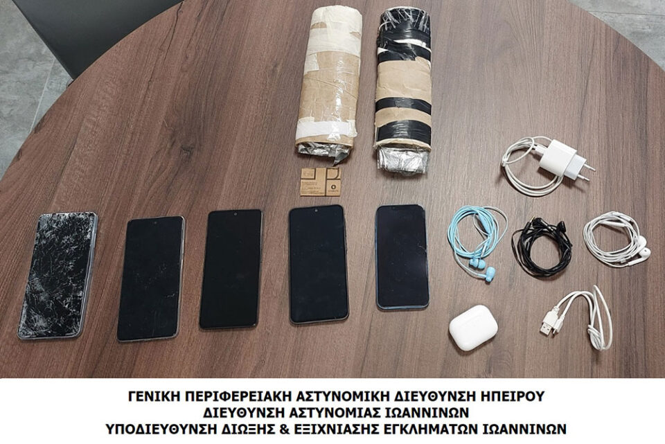 Κατά τον έλεγχο, ο οποίος διενεργήθηκε παρουσία εισαγγελικού λειτουργού, βρέθηκαν συνολικά και κατασχέθηκαν, 5- κινητά τηλέφωνα, εκ των οποίων τα -4- έφεραν κάρτα SIM, 2- επιπλέον κάρτες SIM και 4- ζεύγη ακουστικών.