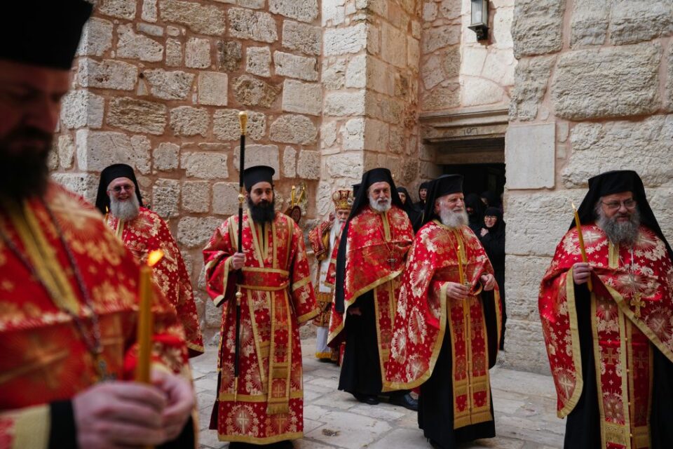 Ελληνορθόδοξοι κληρικοί συμμετέχουν στην τελετή του πλυσίματος των ποδιών στην Εκκλησία του Παναγίου Τάφου, μετά την άρση των περιορισμών που επιβλήθηκαν λόγω της εκεχειρίας που επιτεύχθηκε μεταξύ Ιράν, Ισραήλ και των Ηνωμένων Πολιτειών, στην Παλιά Πόλη των Ιεροσολύμων, την Πέμπτη 9 Απριλίου 2026. (Φωτογραφία AP/Mahmoud Illean)