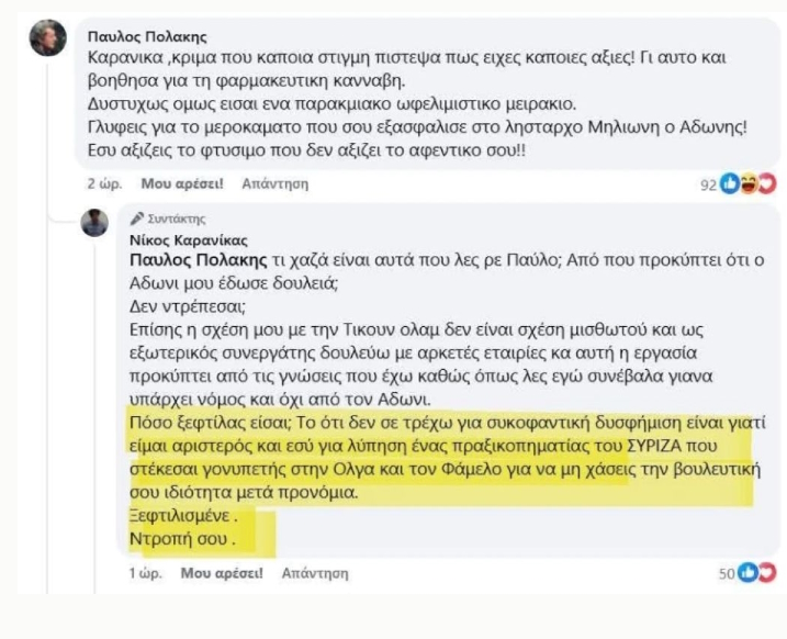 Ο βουλευτής του ΣΥΡΙΖΑ σχολίασε κάτω από την ανάρτηση, αποκαλώντας τον Νίκο Καρανίκα «παρακμιακό ωφελιμιστικό μειράκιο». Παράλληλα, τον κατηγόρησε ότι «γλείφει» τον υπουργό Υγείας, αφήνοντας υπαινιγμούς σχετικά με την επαγγελματική δραστηριότητά του στον χώρο της φαρμακευτικής κάνναβης.