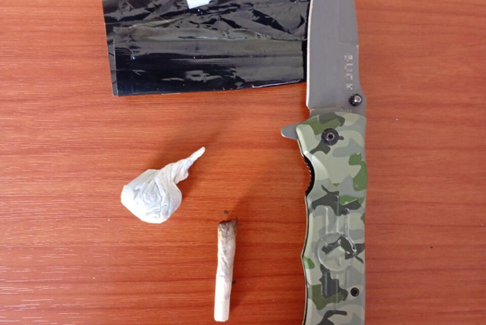 Κατά την έρευνα που επακολούθησε στο κατάλυμα καθώς και στη μόνιμη κατοικία τού ημεδαπού, βρέθηκαν και κατασχέθηκαν μικροποσότητες ακατέργαστης κάνναβης και αναδιπλούμενο μαχαίρι μήκους -20- εκατοστών.
