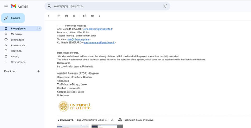 Μεταφρασμένη η δήλωση του Πανεπιστημίου : (Αγαπητέ Δήμαρχε Πάργας, Επισυνάπτουμε σχετικά αποδεικτικά στοιχεία από την πλατφόρμα Interreg, τα οποία επιβεβαιώνουν ότι το έργο δεν υποβλήθηκε με επιτυχία. Η μη υποβολή οφειλόταν σε τεχνικά προβλήματα που σχετίζονται με τη λειτουργία του συστήματος, τα οποία δεν μπόρεσαν να επιλυθούν εντός της προθεσμίας υποβολής.