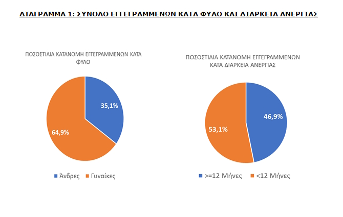 Από αυτούς τους άνεργους, 403.847 (ποσοστό 46,89%) άτομα είναι εγγεγραμμένα στο μητρώο της ΔΥΠΑ για χρονικό διάστημα ίσο ή και περισσότερο των 12 μηνών και 457.394 (ποσοστό 53,11%) είναι εγγεγραμμένα στο μητρώο της ΔΥΠΑ για χρονικό διάστημα μικρότερο των 12 μηνών.