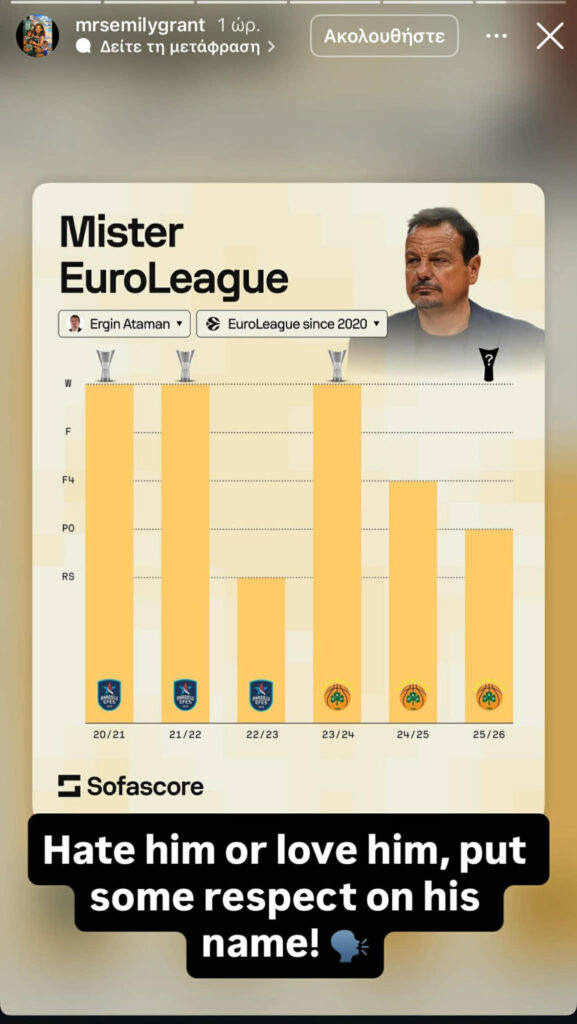 Σε αυτό το πλαίσιο, η Έμιλι Γκραντ αναδημοσίευσε μια ανάρτηση της Euroleague που τόνιζε την εντυπωσιακή πορεία του Αταμάν από το 2020, με τρεις κατακτήσεις του τροπαίου και μία ακόμη συμμετοχή σε Final Four. Σχολιάζοντας, η σύζυγος του Αμερικανού γκαρντ έγραψε χαρακτηριστικά: «Είτε τον μισείς, είτε τον αγαπάς, να δείχνεις λίγο σεβασμό στο πρόσωπό του».