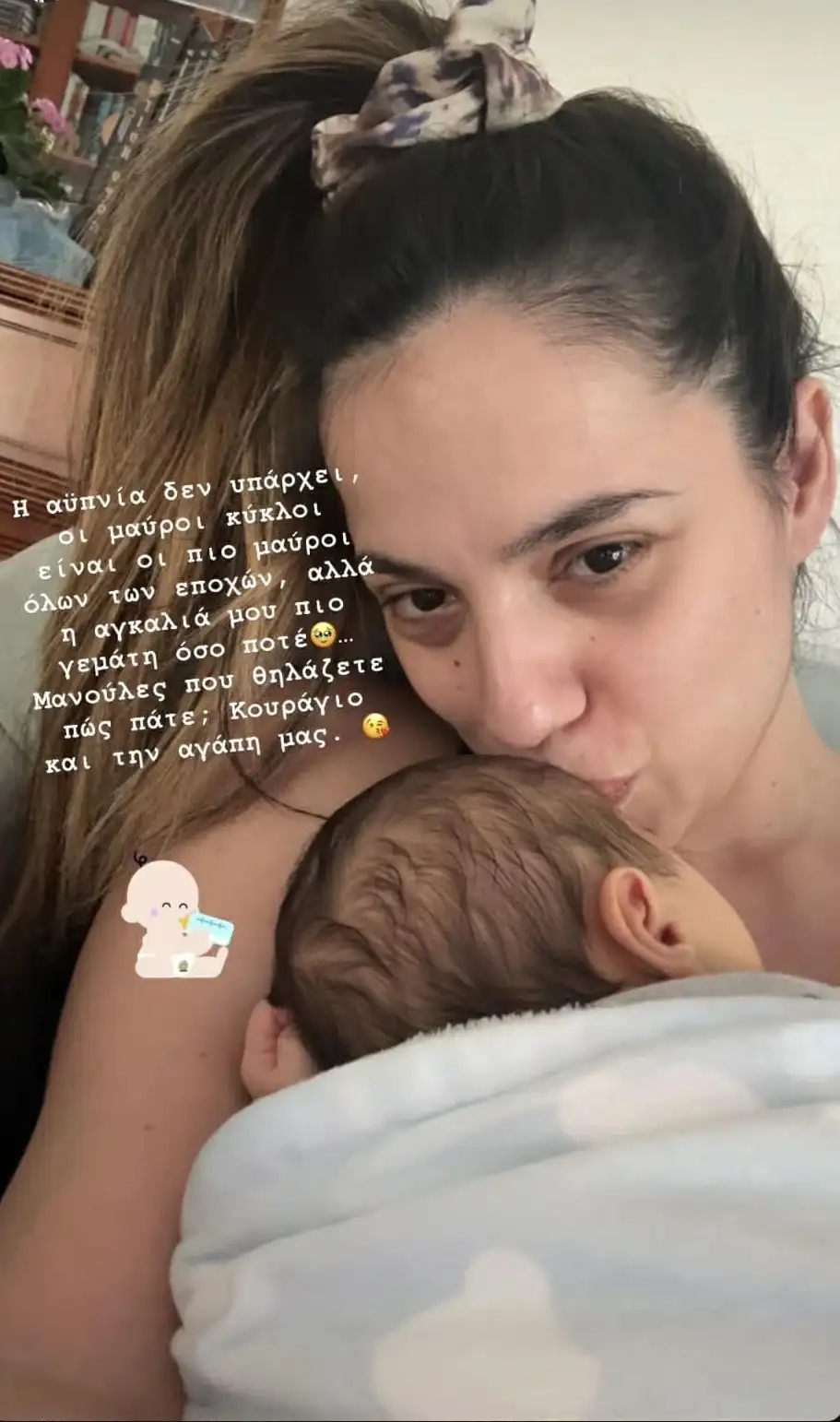 Στη λεζάντα της ανάρτησής της έγραψε: «Η αϋπνία δεν υπάρχει, οι μαύροι κύκλοι είναι οι πιο μαύροι όλων των εποχών, αλλά η αγκαλιά μου πιο γεμάτη από ποτέ… Μανούλες που θηλάζετε, πώς πάτε; Κουράγιο και την αγάπη μας».