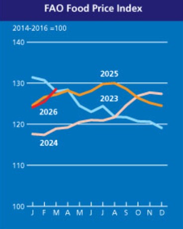 Ο Δείκτης Τιμών Τροφίμων του FAO, που παρακολουθεί τις τιμές των διεθνώς εμπορευόμενων τροφίμων, κατέγραψε αύξηση 2,4% σε σύγκριση με τον αναθεωρημένο δείκτη του Φεβρουαρίου. Παρά τη μέτρια αύξηση, ο δείκτης παραμένει 1% πάνω από την τιμή του ίδιου μήνα πέρυσι, αλλά περίπου 20% κάτω από τα ιστορικά υψηλά του Μαρτίου 2022, που σημειώθηκαν μετά την έναρξη του πολέμου στην Ουκρανία.