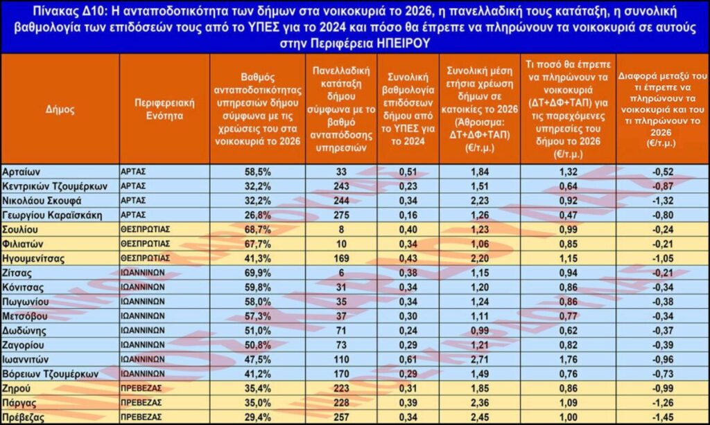 Σε πρόσφατη δημοσιευμένη έρευνά μου (10/3/2026) με τίτλο: «Αυτοί είναι οι ακριβότεροι και οι φθηνότεροι δήμοι για κατοικίες στην Ελλάδα το 2026», παρουσιάσθηκε η συνολική μέση ετήσια χρέωση των δήμων στα νοικοκυριά για το 2026 (Άθροισμα των ΔΤ, ΔΦ και ΤΑΠ).