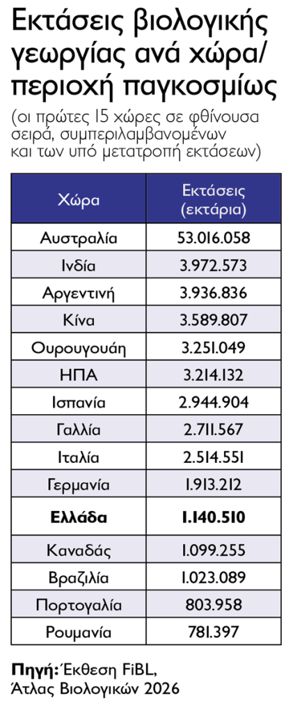 Με περίπου 1,14 εκατ. εκτάρια βιολογικών εκτάσεων το 2024, οι περισσότερες εκ των οποίων βρίσκονταν στο μεταβατικό στάδιο της μετατροπής (685.275 εκτάρια) η Ελλάδα διέθετε ένα μερίδιο βιολογικών της τάξεως του 21,7%, καταλαμβάνοντας την 6 θέση μεταξύ των ευρωπαϊκών κρατών με τα υψηλότερα μερίδια, αλλά και διεθνώς, χωρίς, ωστόσο, να εμφανίζει μεταβολή από την προηγούμενη χρονιά. Παράλληλα, σε απόλυτους αριθμούς, σε όρους εκτάσεων η χώρα μας ερχόταν 11ή μεταξύ των κρατών παγκοσμίως που παρείχαν στοιχεία. Τα δεδομένα αυτά, καθιστούν τις ελληνικές επιδόσεις πολύ κοντά στον ευρωπαϊκό στόχο του 25% βιολογικών εκτάσεων ως το 2030.