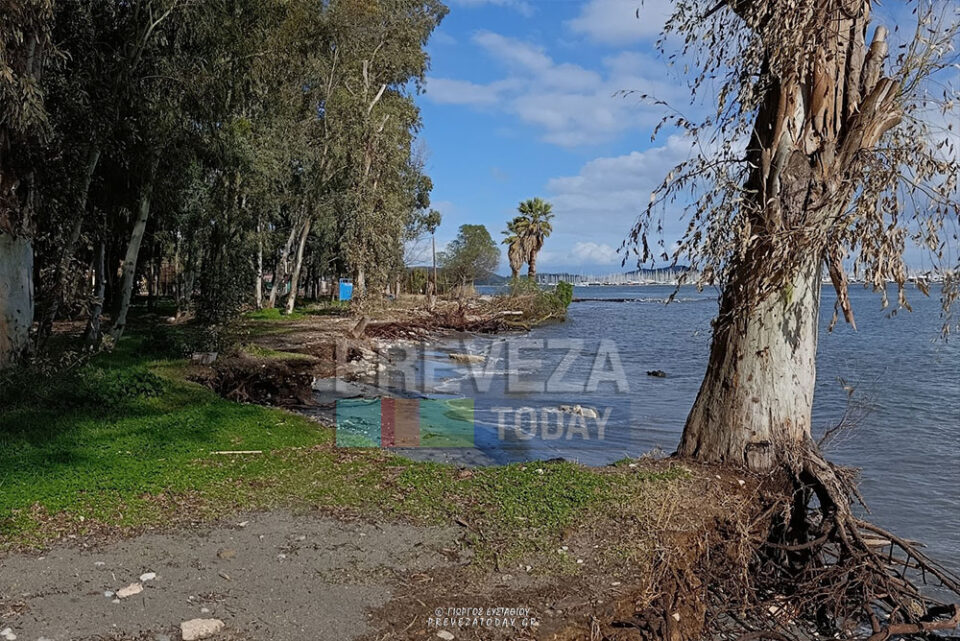 Την τραγικότητα της κατάστασης αποτυπώνουν και τα κουφάρια δέντρων που έχουν πέσει πρόσφατα και χτυπιούνται συνεχώς από τη θάλασσα, ενώ ήδη μέσα στο νερό βρίσκονται και φοίνικες, με το ενδεχόμενο κατάρρευσης τους να θεωρείται θέμα χρόνου.