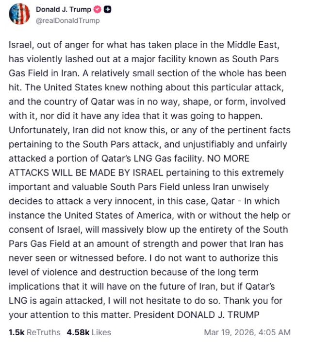 «Το Ισραήλ, από οργή για όσα συνέβησαν στη Μέση Ανατολή, επιτέθηκε με βία σε μια σημαντική εγκατάσταση γνωστή ως το πεδίο φυσικού αερίου South Pars στο Ιράν. Ένα σχετικά μικρό τμήμα του πεδίου χτυπήθηκε. Οι Ηνωμένες Πολιτείες δεν είχαν καμία γνώση για αυτήν την επίθεση και το Κατάρ δεν είχε καμία απολύτως εμπλοκή, ούτε γνώριζε ότι επρόκειτο να συμβεί. Δυστυχώς, το Ιράν δεν γνώριζε αυτό ή οποιαδήποτε από τα σχετικά γεγονότα που αφορούσαν την επίθεση στο South Pars και άδικα και αβάσιμα επιτέθηκε σε μια μέρος της εγκατάστασης LNG του Κατάρ.