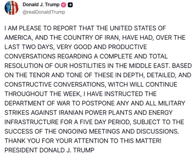 «Είμαι στην ευχάριστη θέση να αναφέρω ότι οι Ηνωμένες Πολιτείες της Αμερικής και η χώρα του Ιράν είχαν, κατά τη διάρκεια των τελευταίων δύο ημερών, πολύ καλές και παραγωγικές συνομιλίες σχετικά με μια πλήρη και οριστική επίλυση των εχθροπραξιών μας στη Μέση Ανατολή. Με βάση το ύφος και τον τόνο αυτών των σε βάθος, λεπτομερών και εποικοδομητικών συνομιλιών, οι οποίες θα συνεχιστούν καθ’ όλη τη διάρκεια της εβδομάδας, έχω δώσει εντολή στο Υπουργείο Πολέμου να αναβάλει οποιαδήποτε και όλα τα στρατιωτικά πλήγματα κατά ιρανικών σταθμών παραγωγής ενέργειας και ενεργειακών υποδομών για περίοδο πέντε ημερών, υπό την προϋπόθεση της επιτυχούς εξέλιξης των εν εξελίξει συναντήσεων και συζητήσεων. Ευχαριστώ για την προσοχή σας στο ζήτημα αυτό! Πρόεδρος Ντόναλντ Τζ. Τραμπ».