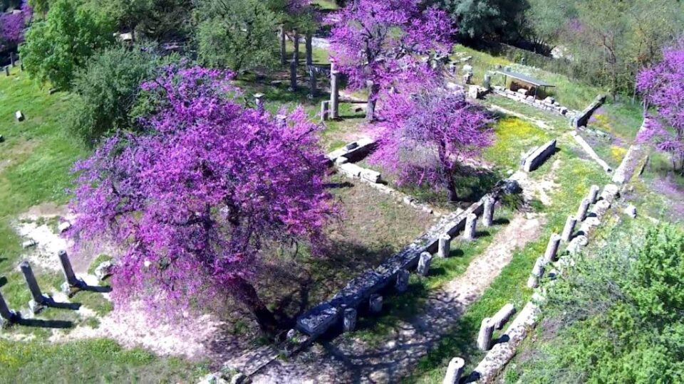 Κάθε άνοιξη, ο αρχαιολογικός χώρος της Αρχαίας Ολυμπίας αποκτά ξεχωριστή ομορφιά, καθώς ανάμεσα στους κίονες από ιερό κογχυλιάτη και στα αιωνόβια δέντρα, ξεχωρίζει το δέντρο της κουτσουπιάς.