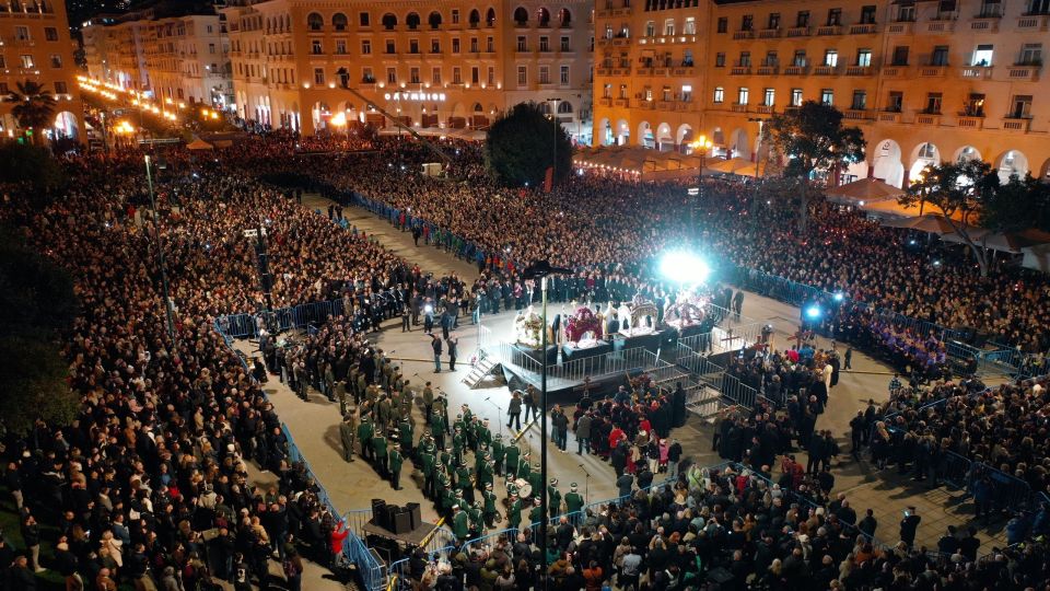 Χιλιάδες πιστοί, ξεκινώντας από πέντε ναούς της Θεσσαλονίκης συναντήθηκαν ακολουθώντας τους πέντε Επιτάφιους στην πλατεία Αριστοτέλους.