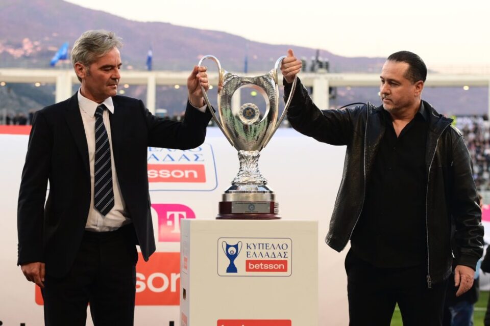 Λίγο πριν από την έναρξη του μεγάλου τελικού, δύο εμβληματικές μορφές του ελληνικού ποδοσφαίρου χάρισαν μια ξεχωριστή στιγμή στο Πανθεσσαλικό.