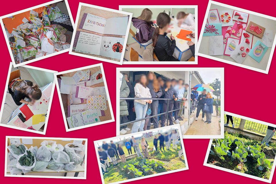Οι μαθητές και μαθήτριες προσέφεραν εδέσματα και πασχαλινές κάρτες στους φιλοξενολυμενους της δομής που είχαν κατασκευάσει οι ίδιοι.