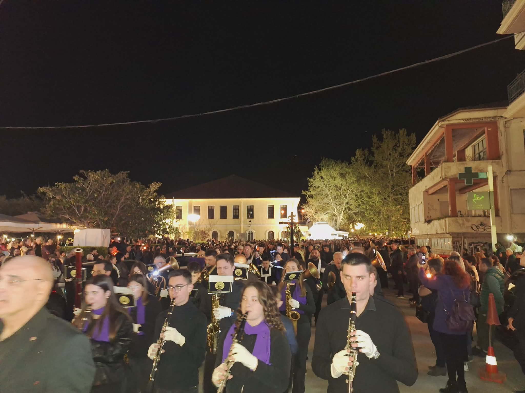 Λίγο μετά τις 22:00 έφτασε ο Επιτάφιος από τον Μητροπολιτικό Ναό του Αγ. Χαραλάμπους συνοδευόμενος από την Φιλαρμονική προεξέχοντος του Μητροπολίτη κ. Χρυσοστόμου.