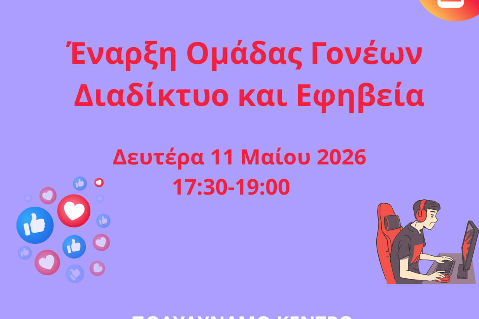 Κύκλο τριών εβδομαδιαίων συναντήσεων ομαδικής συμβουλευτικής για γονείς, αναφορικά με τη διαχείριση της προβληματικής χρήσης του διαδικτύου από τους εφήβους, ξεκινά το Πολυδύναμο Κέντρο Αντιμετώπισης Εξαρτήσεων Πρέβεζας του ΕΟΠΑΕ.