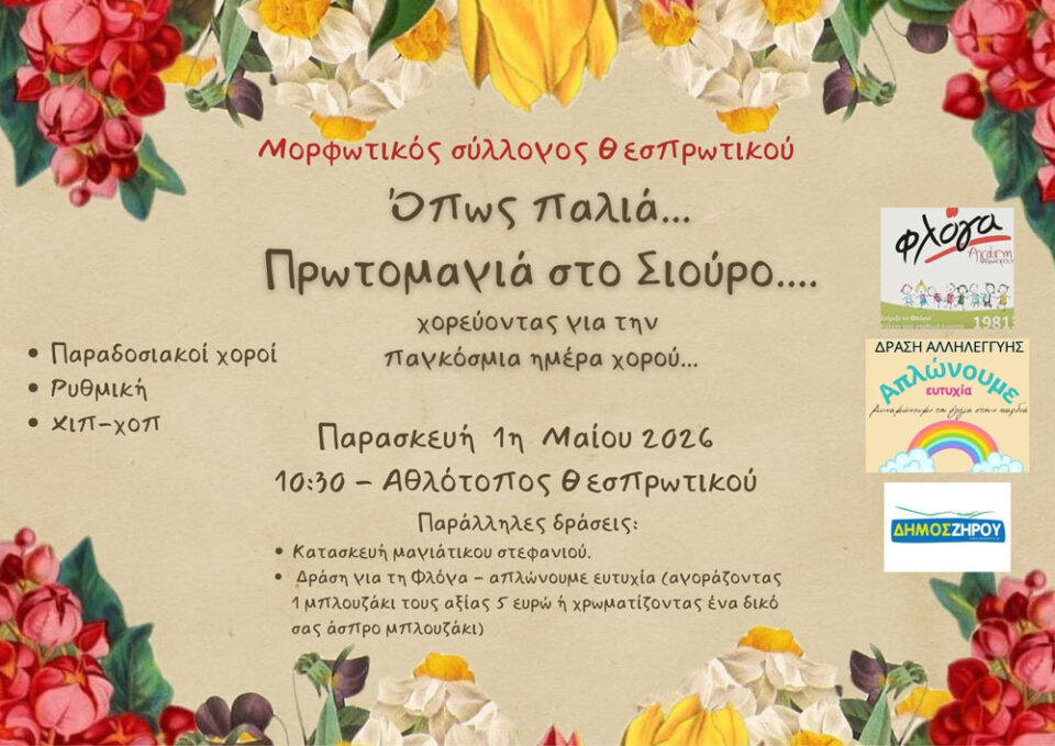 Η εκδήλωση με τίτλο «Όπως παλιά… Πρωτομαγιά στο Σιούρο» θα πραγματοποιηθεί την Παρασκευή 1η Μαΐου 2026, στις 10:30 το πρωί, στον Αθλότοπο Θεσπρωτικού. Στόχος είναι η αναβίωση των εθίμων της Πρωτομαγιάς μέσα από τη μουσική και τον χορό, φέρνοντας κοντά μικρούς και μεγάλους.