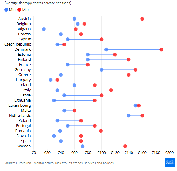 Συνολικά, η Ιρλανδία μπορεί να είναι μία από τις ευρωπαϊκές χώρες όπου η θεραπεία είναι πιο προσιτή. Όχι μόνο το κόστος των συνεδριών είναι λογικό — μεταξύ 60 και 90 ευρώ — αλλά όταν το συγκρίνεις με τους τοπικούς μισθούς, 10 ιδιωτικές συνεδρίες ανέρχονται σε περίπου 32% έως 48% του μηνιαίου κατώτατου μισθού, με μέρος του λογαριασμού να καλύπτεται συχνά από την ασφάλιση υγείας.