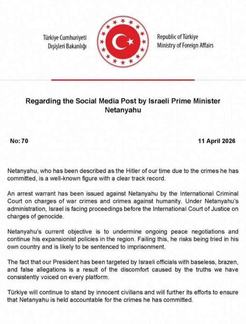 «Ο Νετανιάχου, ο οποίος διαπράττει γενοκτονία στη Γάζα κι επιτίθεται σε επτά χώρες της περιοχής, έχει το θράσος στην απελπισία του να στοχοποιεί τον αξιοσέβαστο πρόεδρό μας», ανέφερε ο Μπουρχανετίν Ντουράν,