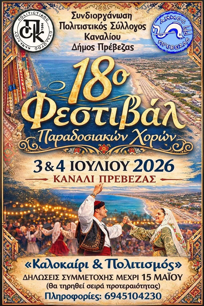 Με σεβασμό στην ελληνική παράδοση και διάθεση ανανέωσης του πολιτιστικού αποτυπώματος της περιοχής, προχωρούν οι προετοιμασίες για το 18ο Φεστιβάλ Παραδοσιακών Χορών, που θα πραγματοποιηθεί στο Κανάλι Πρέβεζας στις 3 και 4 Ιουλίου 2026. Πρόκειται για έναν θεσμό που έχει καθιερωθεί ως σημείο αναφοράς συγκεντρώνοντας χορευτικά σχήματα και φίλους του παραδοσιακού πολιτισμού από όλη τη χώρα.
