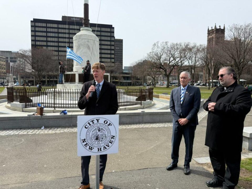 Στο βήμα, ο δήμαρχος του Νιου Χέιβεν Τζάστιν Έλικερ, μαζί με τον τελετάρχη της εκδήλωσης Γκρέγκορι Τζ. Στάμο και τον π. Παναγιώτη Ορφανάκο της κοινότητας Αγίας Βαρβάρας, δεξιά.