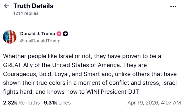 Το Ισραήλ εκθειάζει ο Ντόναλντ Τραμπ στο μοναδικό σχόλιο που έκανε τις τελευταίες ώρες μέσα από την πλατφόρμα του Truth Social.
