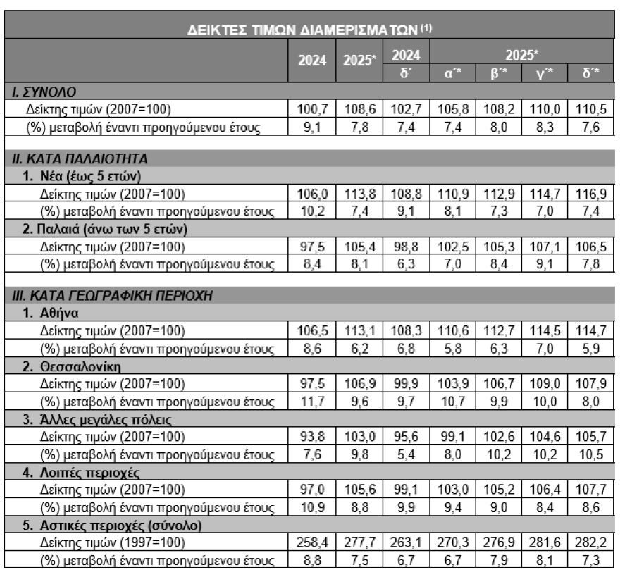Τέλος, για το σύνολο των αστικών περιοχών της χώρας, το δ΄ τρίμηνο του 2025 οι τιμές των διαμερισμάτων ήταν κατά μέσο όρο αυξημένες κατά 7,3% σε σύγκριση με το δ΄ τρίμηνο του 2024, ενώ για το 2025 η μέση ετήσια αύξηση διαμορφώθηκε στο 7,5%.