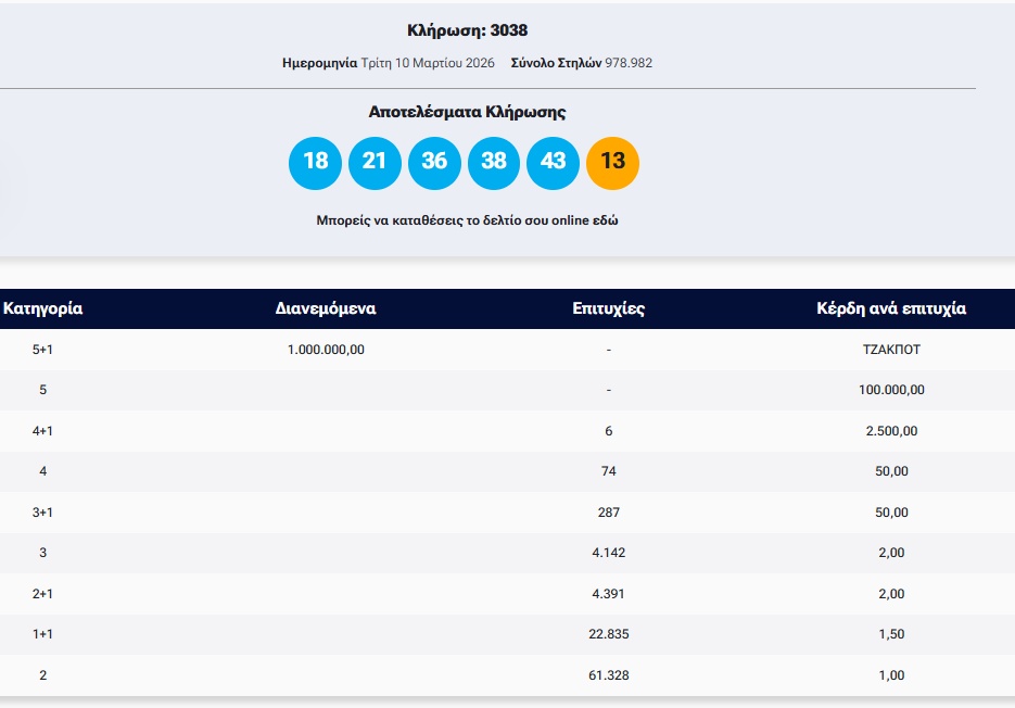 Πραγματοποιήθηκε το βράδυ της Τρίτης (10/3) η κλήρωση 3038 του Τζόκερ που μοιράζει στην πρώτη κατηγορία 1.000.000 ευρώ.