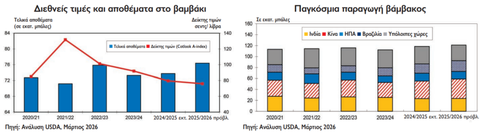 Οι αποδόσεις διεθνώς αναμένεται να κινηθούν στο ρεκόρ των 893 κιλών ανά εκτάριο, σε σύγκριση με τα 859 κιλά πέρυσι. Αυξημένα, όμως, κατά σχεδόν 4% από πέρυσι, προβλέπονται και τα τελικά αποθέματα της περιόδου 2025/2026, τα οποία αναμένεται να φτάσουν στο υψηλότερο επίπεδο της τελευταίας εξαετίας (στις 76,4 εκατ. μπάλες), καθώς και οι τέσσερις μεγαλύτεροι παραγωγοί βάμβακος διεθνώς αναμένουν αυξήσεις. Η συνεχιζόμενη αύξηση των αποθεμάτων αλλά και η αβεβαιότητα για τη ζήτηση οδηγούν σε πτώση της διεθνούς τιμής βαμβακιού (Cotlook A Index), που προβλέπεται κάτω από 80 σεντς ανά λίβρα, για τέταρτη συνεχόμενη χρονιά, όπως προκύπτει από τα στοιχεία του USDA, εν αναμονή και της έκθεσης του Απριλίου.